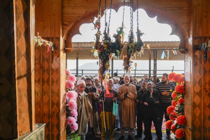 Anantnag: Muslim devotees pray outside the shrine of Sufi saint Sakhi Zain-ud-Din Wali on a hillock during the annual torch festival, which symbolises the victory of good over evil, at Aishmuqam, in Anantnag district, Jammu & Kashmir, Saturday, April 12, 2025. (PTI Photo/S Irfan)(PTI04_13_2025_000163B)