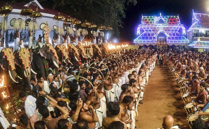 Thrissur: People celebrate the �Arattupuzha Pooram� festival at the Sree Sastha Temple, in Thrissur district, Kerala, Wednesday, April 9, 2025. (PTI Photo) (PTI04_09_2025_000632B)