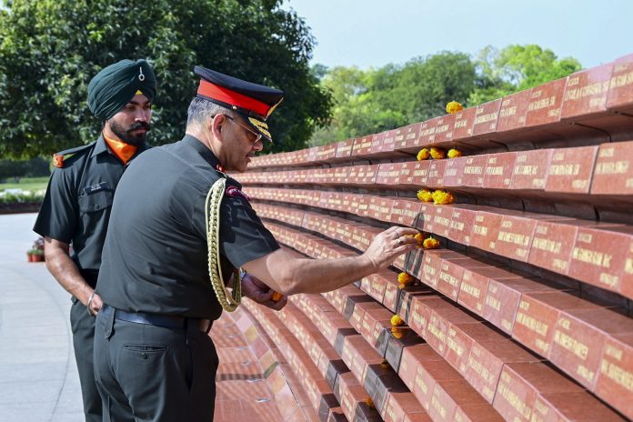 **EDS: THIRD PARTY IMAGE** In this image posted on March 30, 2026, Vice Chief of the Army Staff Lt. General Pushpendra Pal Singh pays tribute at the National War Memorial after relinquishing the appointment of Vice Chief of the Army Staff (VCOAS), in New Delhi. (@adgpi/X via PTI Photo)(PTI03_30_2026_000227B)
