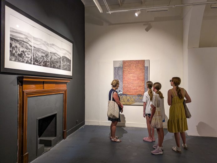 **EDS: TO GO WITH STORY** New Delhi: Visitors look at artworks by Lal Bahadur Singh at an exhibition titled ‘Silent Echoes of a Flight Beyond…and Whispers of the Earth Beneath’, at Bikaner House, in New Delhi. (PTI Photo/Manish Sain)(PTI04_08_2025_000351B)