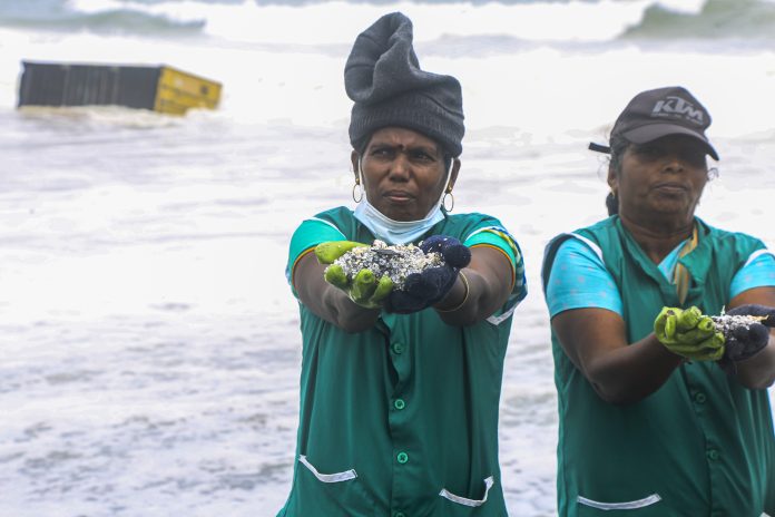Kanyakumari: Colachel Municipal Corporation workers show collected plastic pellets at a beach after they were washed ashore along with a container, following the recent sinking of a Liberian-flagged container ship MSC ELSA 3, in Kanyakumari district, Tamil Nadu, Thursday, May 29, 2025. (PTI Photo) (PTI05_29_2025_000230B)