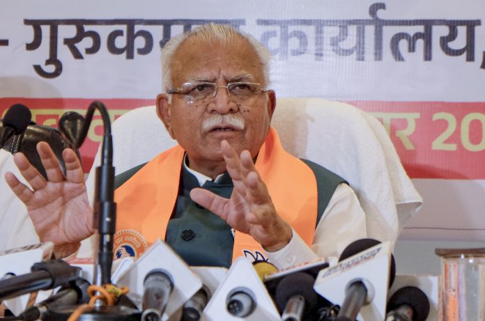 **EDS: RPT, CORRECTS HEADLINE** Gurugram: Union Minister of Housing and Urban Affairs Manohar Lal addresses a press conference on 'Atmanirbhar Bharat', in Gurugram, Haryana, Friday, Oct. 3, 2025. (PTI Photo) (PTI10_03_2025_RPT223B)