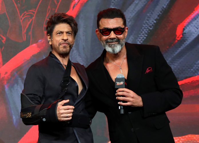 Mumbai: Bollywood actors Shah Rukh Khan and Bobby Deol during the preview launch of the former's son Aryan Khan's directorial debut on Netflix 'The Ba***ds of Bollywood', in Mumbai, Wednesday, Aug. 20, 2025. (PTI Photo)(PTI08_20_2025_000428B)