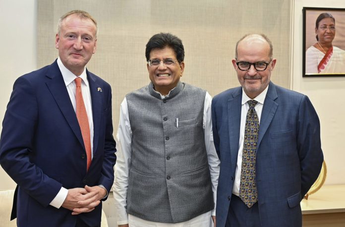 **EDS: THIRD PARTY IMAGE** In this image posted on Feb. 23, 2026, Union Minister Piyush Goyal with UK India Business Council Chair Richard Heald and Salmon Scotland CEO Tavish Scott during a meeting. (@PiyushGoyal/X via PTI Photo) (PTI02_23_2026_000425B)