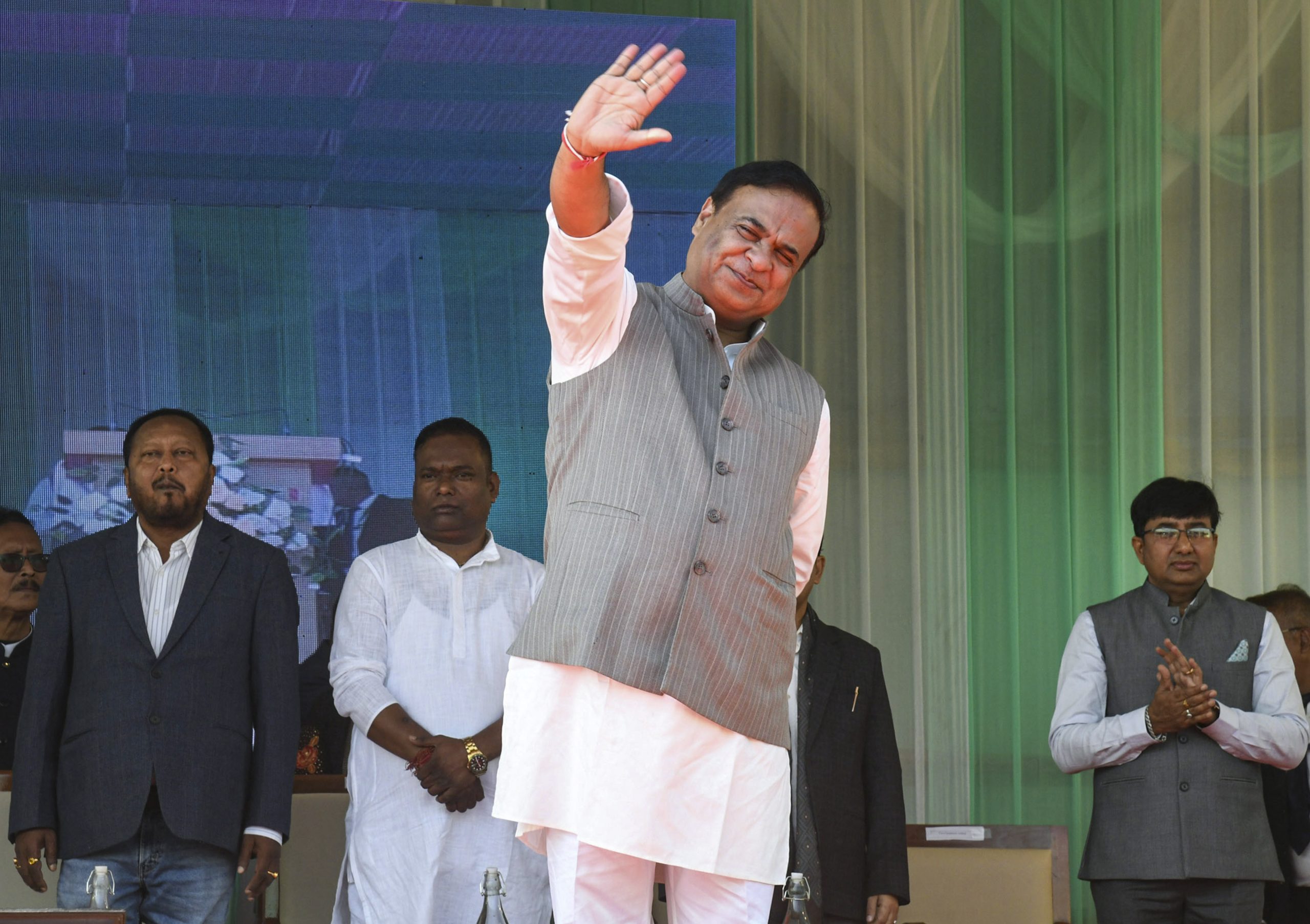 Tezpur: Assam Chief Minister Himanta Biswa Sarma waves to the gathering during a cheque distribution ceremony under the 'Mukhyamantri Mahila Udyamita Abhiyan', in Tezpur, Assam, Monday, Jan. 12, 2026. (PTI Photo)(PTI01_12_2026_000294B)