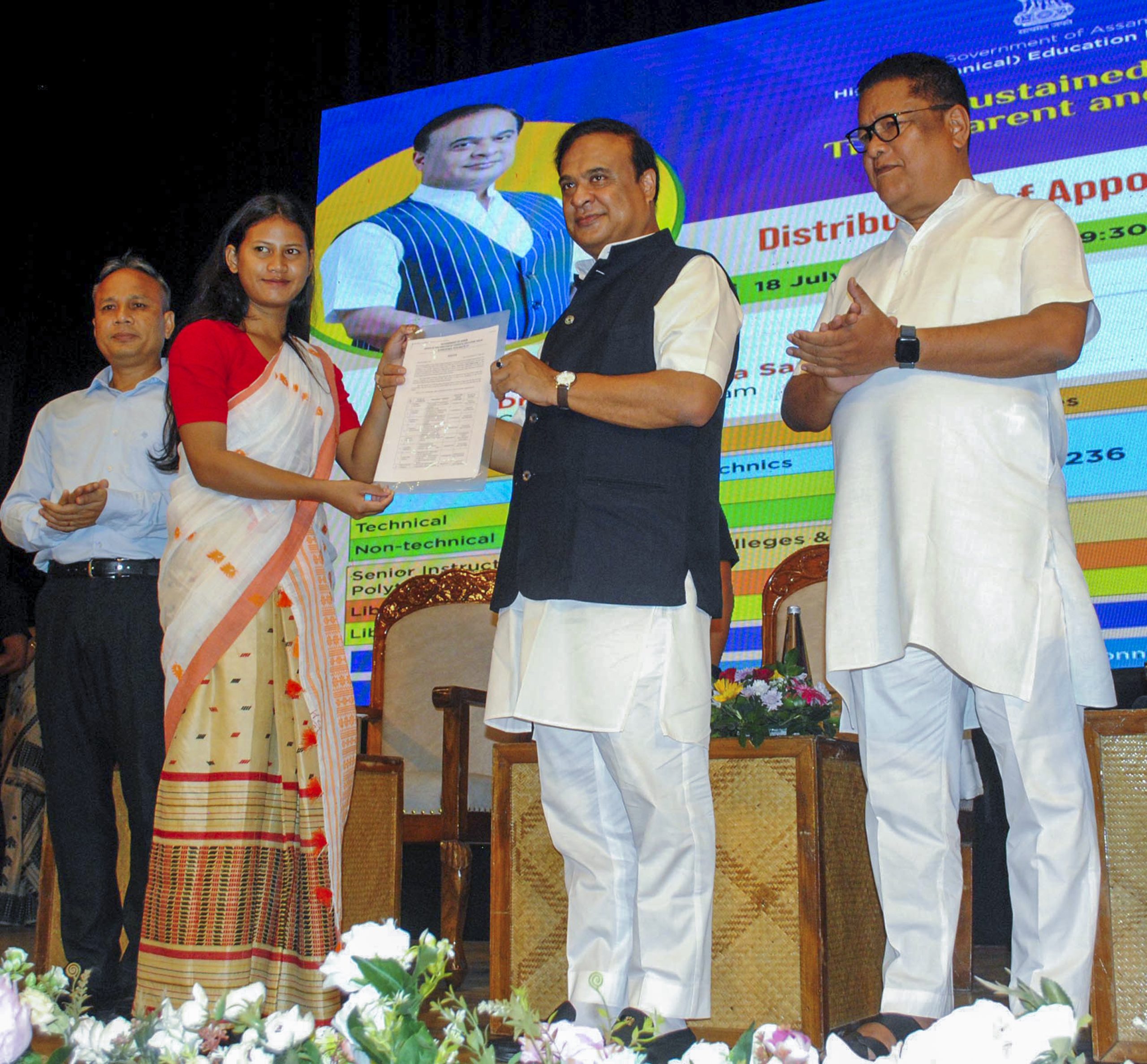 Guwahati: Assam Chief Minister Himanta Biswa Sarma during the distribution of appointment letters to newly recruited Lecturers (Technical), Lecturers (Non-technical), Senior Instructors and Librarians in Government Polytechnic and Engineering Colleges, at Gauhati Medical College and Hospital, Bhangagarh, in Guwahati, Friday, July 18, 2025. (PTI Photo) (PTI07_18_2025_000415B)