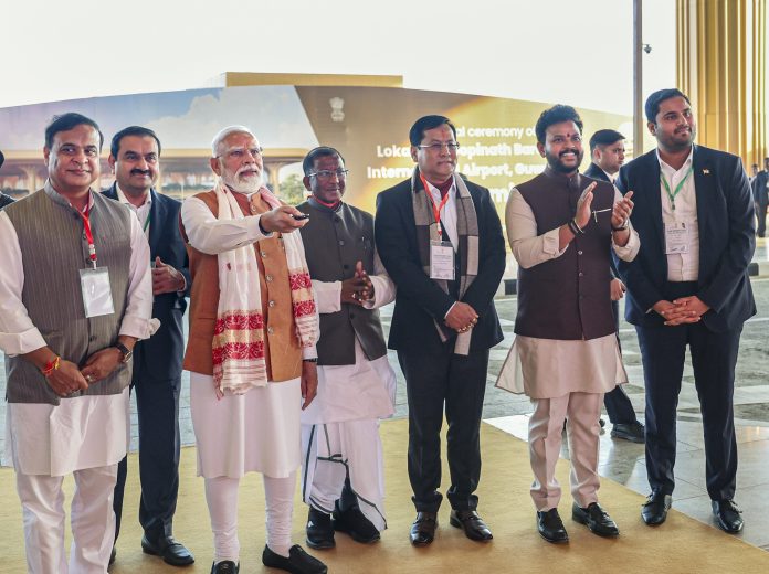**EDS: THIRD PARTY IMAGE** In this image received on Dec. 20, 2025, Prime Minister Narendra Modi, third from left, with Assam Governor Lakshman Prasad Acharya, centre, Union Minister of Civil Aviation K Rammohan Naidu, second from right, Union Minister Sarbananda Sonowal, third from right, Chief Minister Himanta Biswa Sarma, extreme left, and Adani Group Chairperson Gautam Adani, second from left, during the inauguration of a new terminal of the Lokapriya Gopinath Bardoloi International Airport, in Guwahati, Assam. (PMO via PTI Photo)(PTI12_20_2025_000232B)