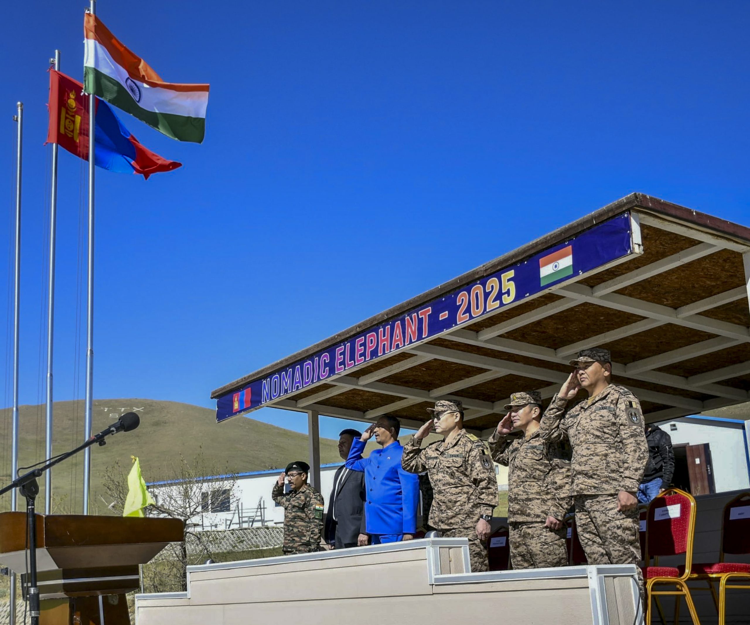 **EDS; THIRD PARTY** In this image via X/@adgpi, June 1, 2025, Indian and Mongolian troops attend the opening ceremony of the 17th edition of Joint Military Exercise ‘Nomadic Elephant 2025’ at the Special Forces Training Centre, Ulaanbaatar, Mongolia. The exercise, being held from May 31 to June 13, aims to enhance joint counter-insurgency and counter-terrorism operations. (X/@adgpi via PTI Photo) (PTI06_01_2025_000036B) *** Local Caption ***
