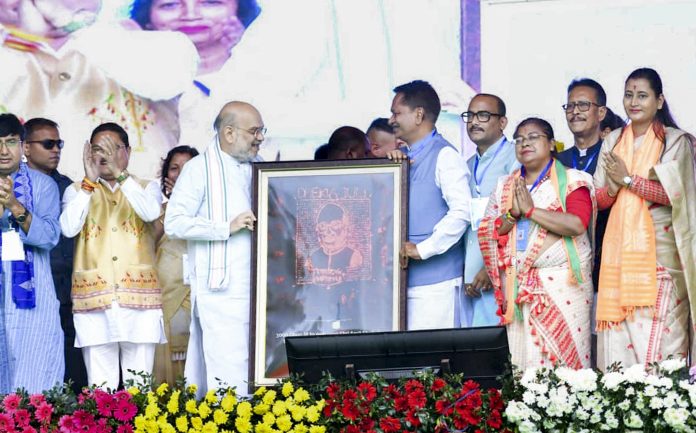 Dhekiajuli: Union Minister Amit Shah and Assam BJP President Dilip Saikia with others during a public meeting in support of NDA candidates ahead of the state Assembly elections, in Dhekiajuli, Sonitpur district, Sunday, March 29, 2026. (PTI Photo) (PTI03_29_2026_000284B)