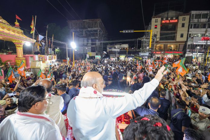 **EDS: THIRD PARTY IMAGE** In this image posted on March 28, 2026, Union Home Minister Amit Shah greets supporters during a roadshow in support of NDA candidates, ahead of the Assam Assembly elections, in Guwahati. (@AmitShah/X via PTI Photo) (PTI03_28_2026_000383B)
