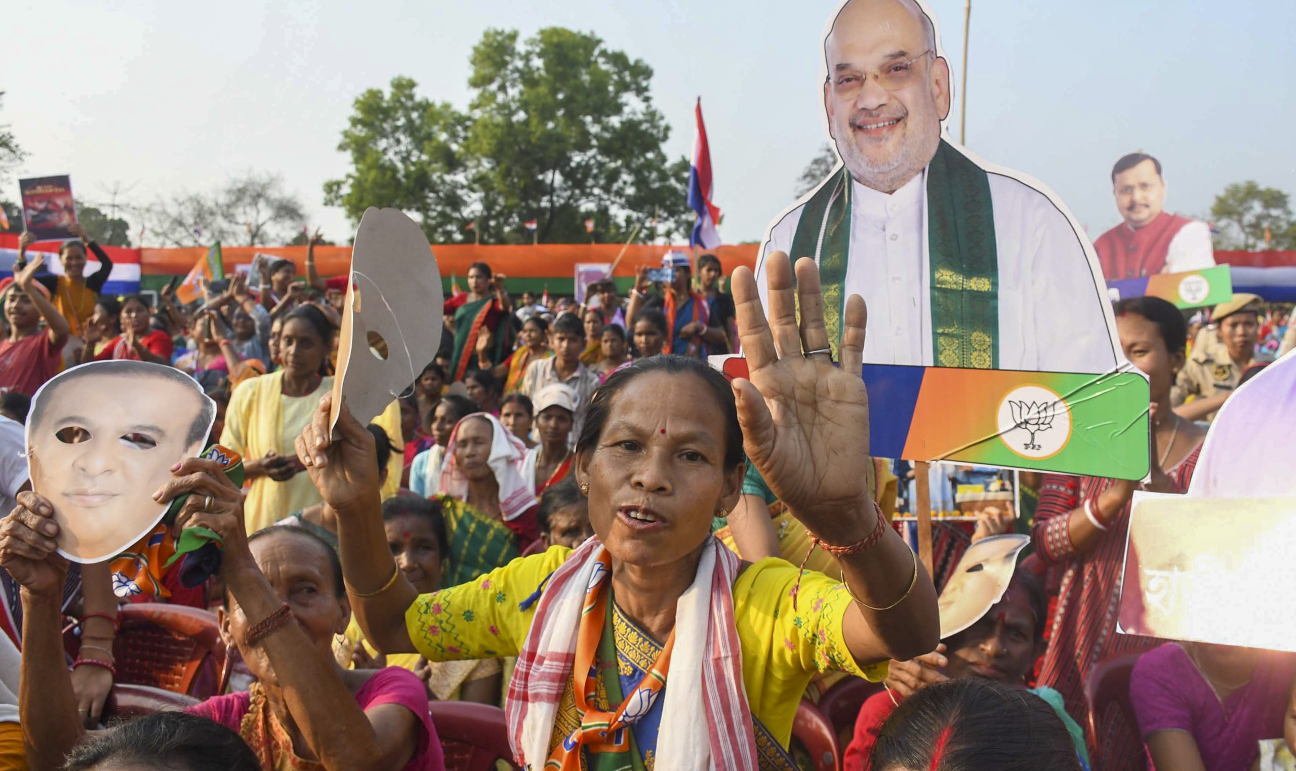 Nagaon: Supporters gather at a public rally addressed by Union Home Minister Amit Shah, unseen, in support of state Minister and Asom Gana Parishad’s (AGP) candidate from Kaliabor constituency Keshab Mahanta ahead of the Assam Assembly elections, in Nagaon district, Thursday, April 2, 2026. (PTI Photo)(PTI04_02_2026_000284B)
