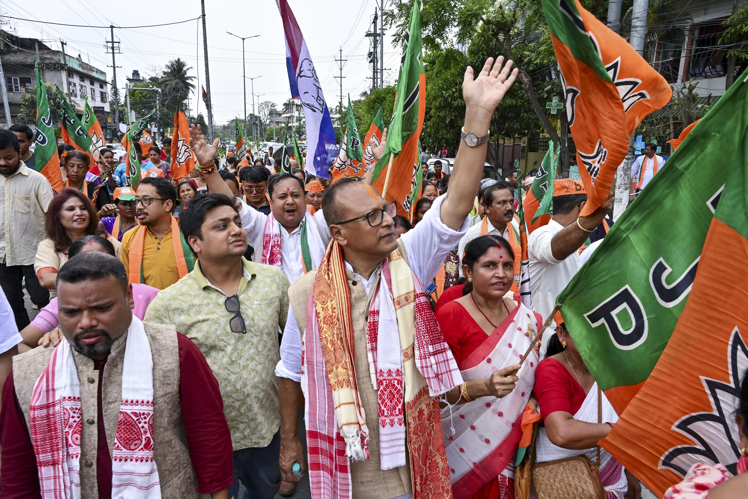 Guwahati: BJP candidate for Dispur constituency, Pradyut Bordoloi, greets the supporters during an election campaign ahead of the Assam Assembly Election, at Panjabari in Guwahati, Wednesday, April 1, 2026. (PTI Photo)(PTI04_01_2026_000258B)