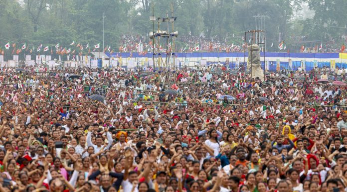 **EDS: THIRD PARTY IMAGE** In this image received on April 1, 2026, people gather at a public meeting of Prime Minister Narendra Modi, unseen, in Gogamukh, Assam. (PMO via PTI Photo)(PTI04_01_2026_000192B)