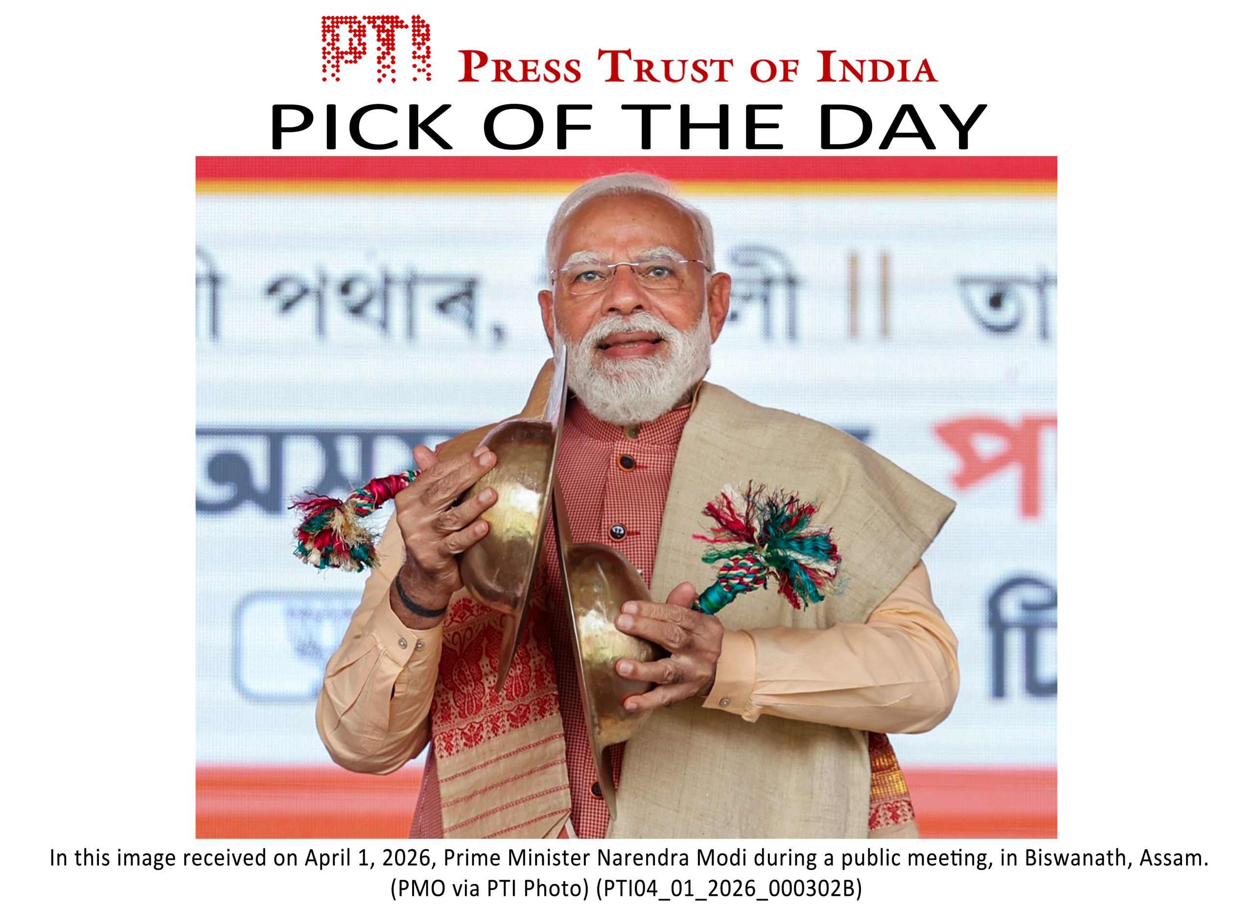 PLS TAKE NOTE OF THIS PTI PICK OF THE DAY::: **EDS: THIRD PARTY IMAGE** In this image received on April 1, 2026, Prime Minister Narendra Modi during a public meeting, in Biswanath, Assam. (PMO via PTI Photo) (PTI04_01_2026_000302B)(PTI04_01_2026_000389B)