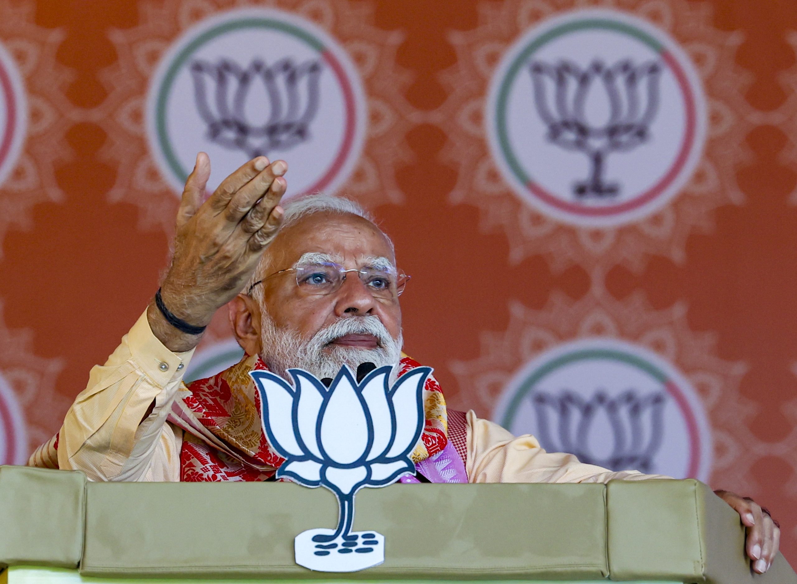 **EDS: THIRD PARTY IMAGE** In this image received on April 1, 2026, Prime Minister Narendra Modi addresses a public meeting, in Biswanath, Assam. (PMO via PTI Photo) (PTI04_01_2026_000305B)