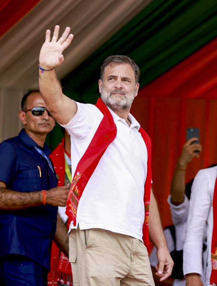 **EDS: THIRD PARTY IMAGE** In this image posted on April 2, 2026, LoP in the Lok Sabha and Congress leader Rahul Gandhi waves to a gathering during a public meeting, in Assam. (@INCIndia/X via PTI Photo)(PTI04_02_2026_000077B)