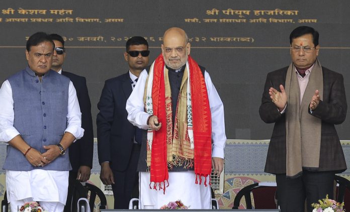 Dibrugarh: Union Home Minister Amit Shah with Union Minister Sarbananda Sonowal and Assam Chief Minister Himanta Biswa Sarma during a public meeting, in Dibrugarh, Friday, Jan. 30, 2026. (PTI Photo)(PTI01_30_2026_000155B)