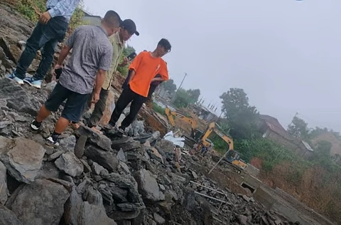 A large section of the hillside collapsed onto the construction site at Hangrum village in Mahur police station area following heavy rainfall since Tuesday night.