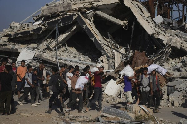 The strikes began late Friday and continued into Saturday morning, among others killing 12 people at the Palestine Stadium in Gaza City, which was sheltering displaced people, and eight more living in apartments, according to staff at Shifa hospital where the bodies were brought.