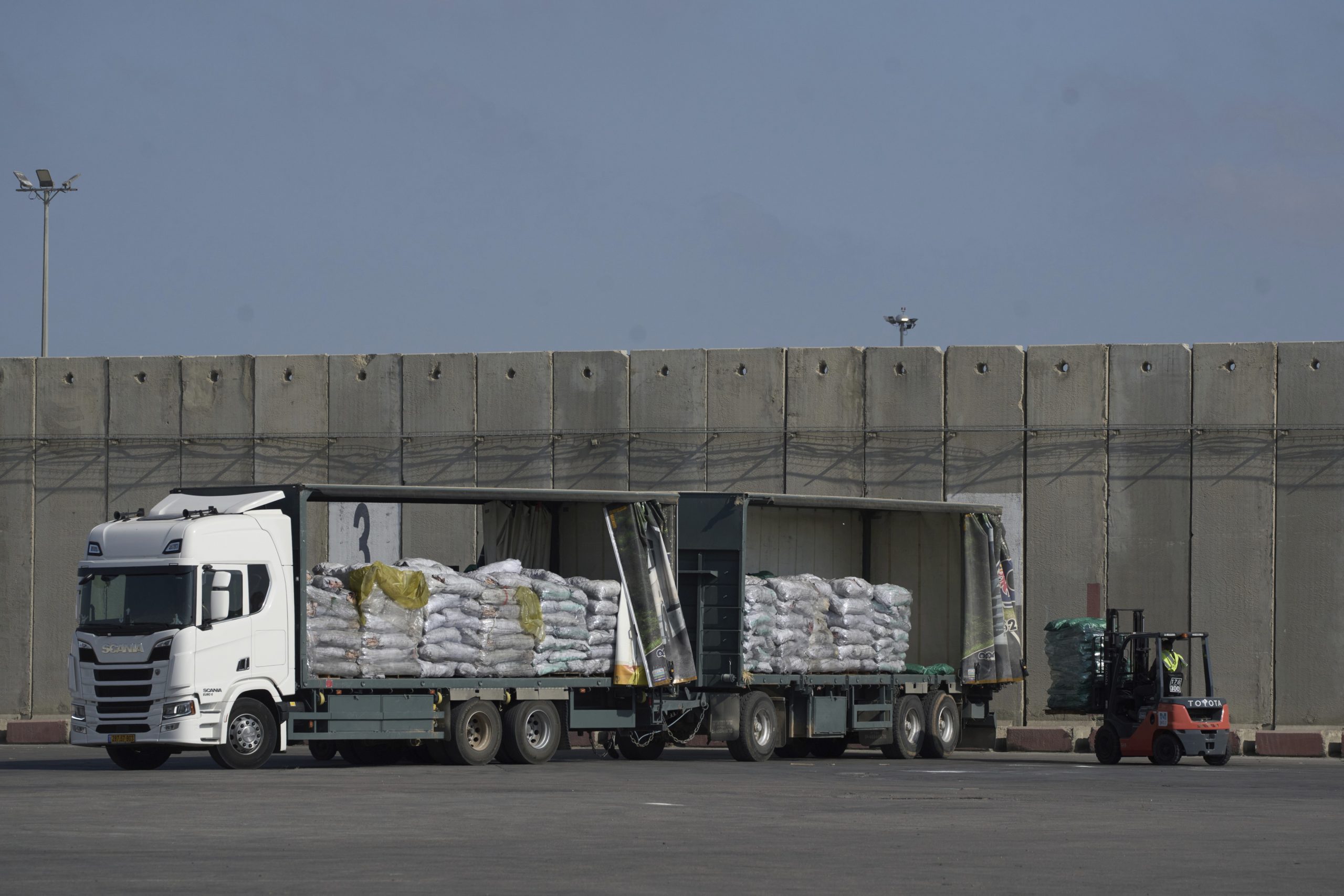 A worker unloads cargo from a truck carrying humanitarian aid for the Gaza Strip at the offload area of the Kerem Shalom border crossing between Israel and Gaza, southern Israel, Thursday, May 22, 2025. AP/PTI(AP05_22_2025_000089B)