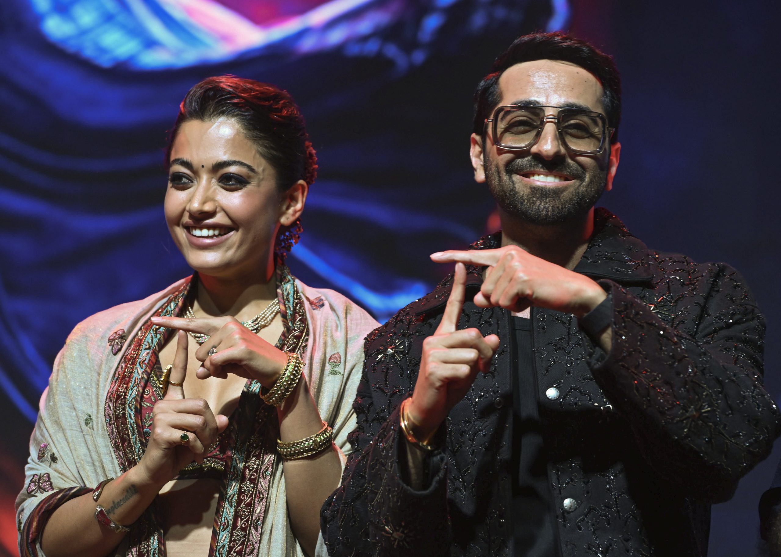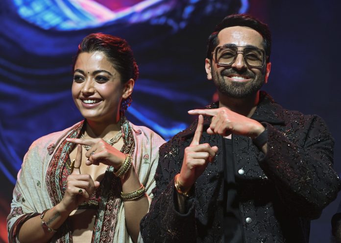 New Delhi: Bollywood actors Rashmika Mandanna, left, and Ayushmann Khurrana during the promotion of their upcoming film ‘Thamma’ at Bharat Mandapam, in New Delhi, Wednesday, Oct. 15, 2025. (PTI Photo) (PTI10_15_2025_000446B)