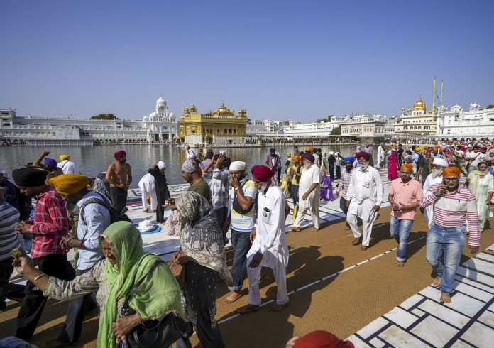 Amritsar: Sikh people pay obeisance at the Golden Temple on the occasion of Baisakhi festival and Khalsa Sajna Diwas, in Amritsar, Sunday, April 13, 2025. (PTI Photo/Shiva Sharma) (PTI04_13_2025_000103B)