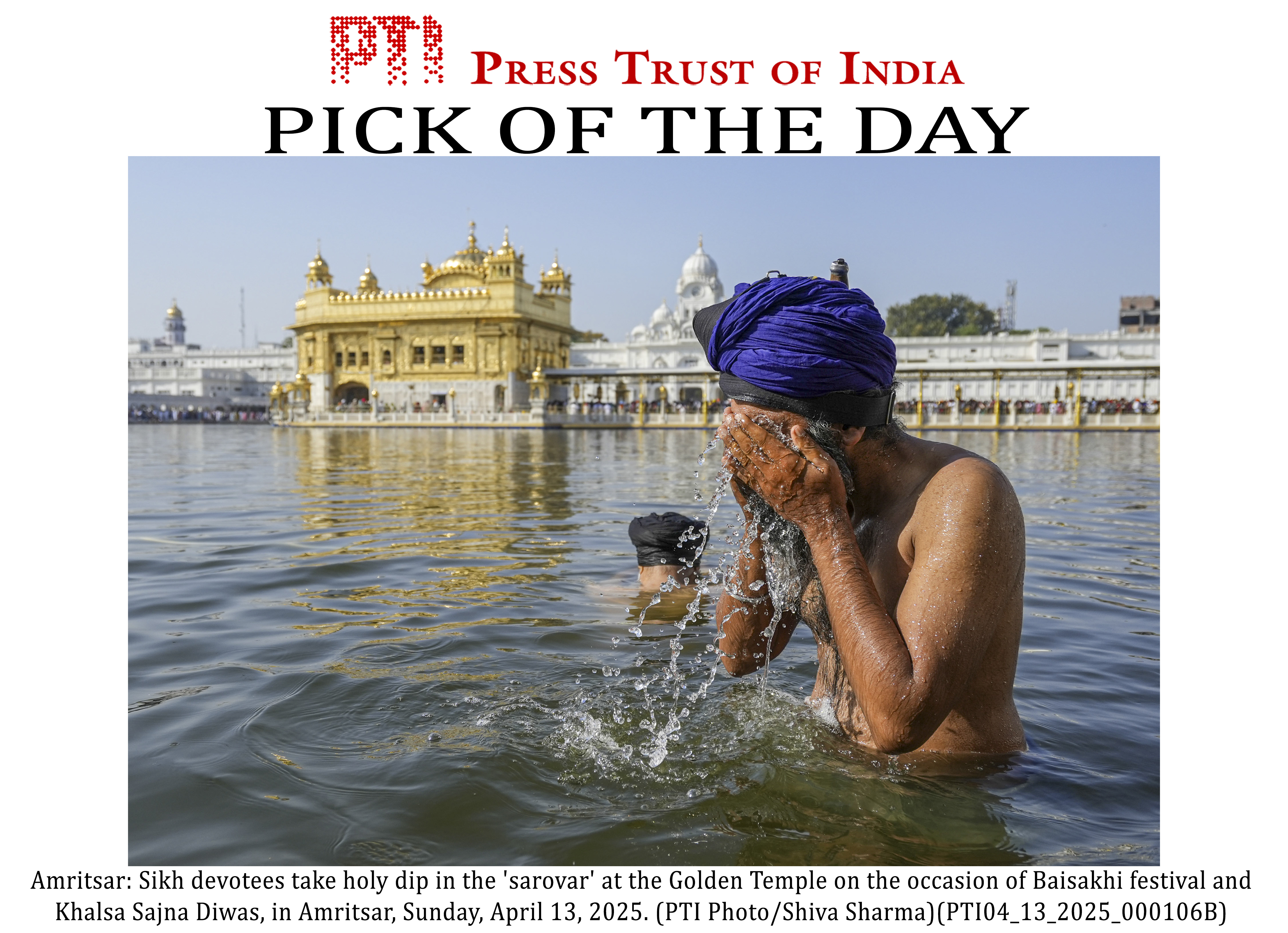 PLS TAKE NOTE OF THIS PTI PICK OF THE DAY::: Amritsar: Sikh devotees take holy dip in the ‘sarovar’ at the Golden Temple on the occasion of Baisakhi festival and Khalsa Sajna Diwas, in Amritsar, Sunday, April 13, 2025. (PTI Photo/Shiva Sharma) (PTI04_13_2025_000106B)(PTI04_13_2025_000271B)