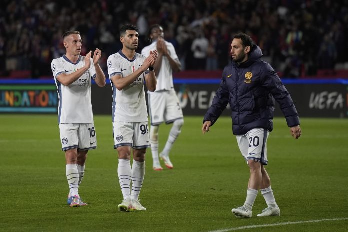 Inter Milan players leave the pitch after the Champions League semifinal first leg soccer match between Barcelona and Inter Milan in Barcelona, Spain, Wednesday, April 30, 2025. AP/PTI(AP05_01_2025_000022B)