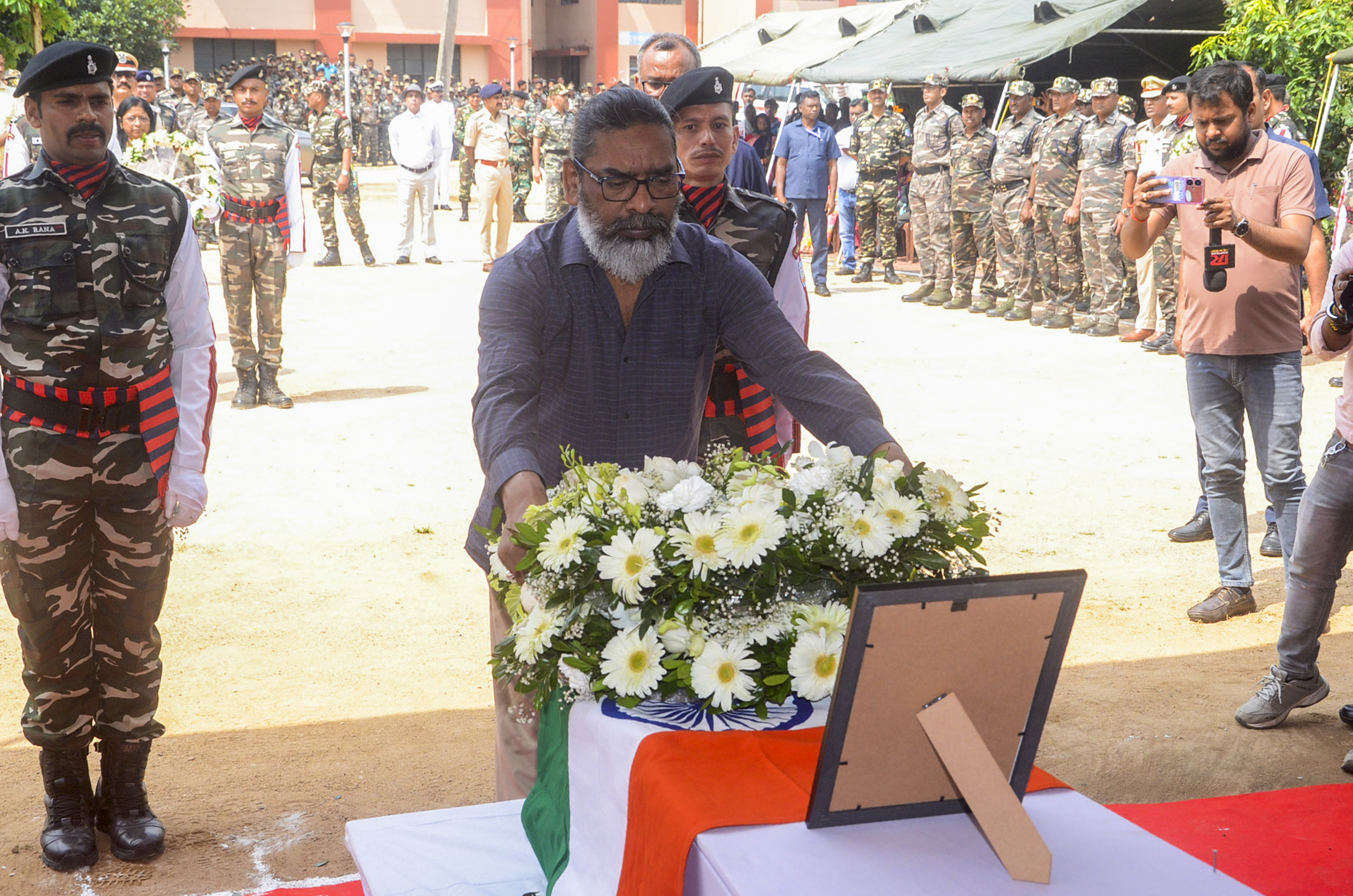 Soren and Governor Santosh Kumar Gangwar paid floral tributes to the mortal remains of jawan, Sunil Dhan, who lost his life in an IED blast in West Singhbhum district on the previous day.