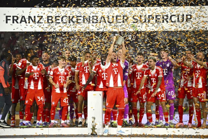 Bayern's Harry Kane celebrates with teammates after winning the German Supercup final soccer match between VfB Stuttgart and Bayern Munich in Stuttgart, Germany, Saturday, Aug. 16, 2025. AP/PTI(AP08_17_2025_000015B)