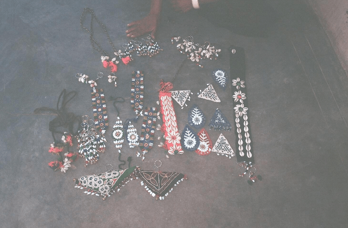 Beadwork along with embroidery is used on garments, soft furnishings and bags. Patches are made with just beadwork on them; these patches can be sewn on a kurta or even a bag. Key chains, brooches, bajuband, belts, bags, torans and parandis are other products that are sold in the local market as well as in exhibitions.
