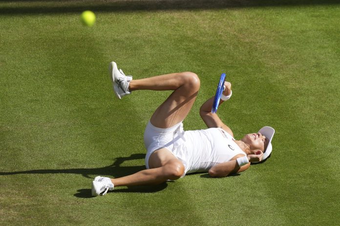 Switzerland's Belinda Bencic slips and falls as she attempted to return to Poland's Iga Swiatek during a women's singles semifinal match at the Wimbledon Tennis Championships in London, Thursday, July 10, 2025. (AP/PTI Photo)(AP07_10_2025_000493B)