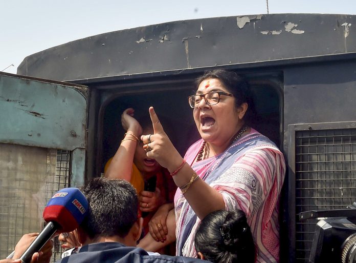 Kolkata: Former BJP MP Locket Chatterjee being detained while embarking upon a protest march with other party functionaries, alleging the failure of West Bengal Chief Minister Mamata Banerjee to protect the interests of school teachers who had got their jobs through honest means, in Kolkata, Monday, April 7, 2025. (PTI Photo)(PTI04_07_2025_000175B)