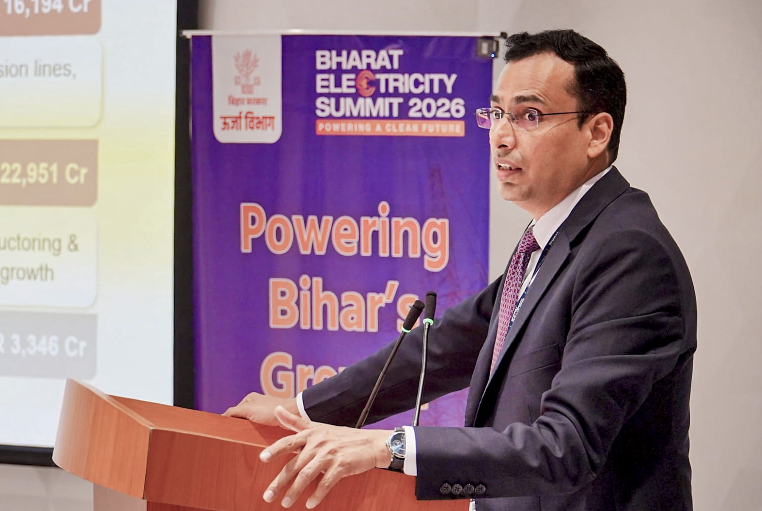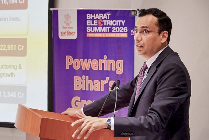 **EDS: THIRD PARTY IMAGE; TO GO WITH STORY** In this image received on March 28, 2026, Bihar Energy Secretary Manoj Kumar Singh (IAS) speaks at ‘Bharat Electricity Summit’, in New Delhi. (Handout via PTI Photo) (PTI03_28_2026_000177B)