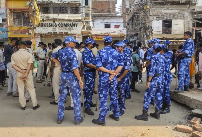 Patna: RAF and police personnel depolyed after clashes between two groups of students at a hostel of Bihar National College, in Patna Tuesday, May 13, 2025. (PTI Photo) (PTI05_13_2025_000167B)