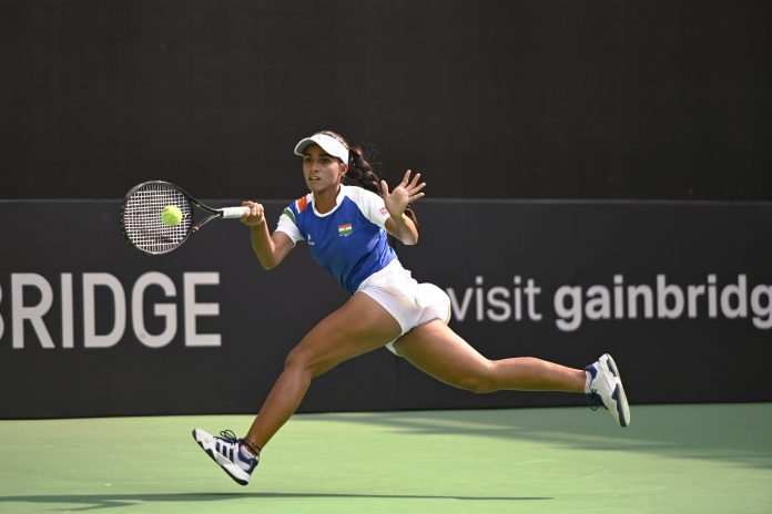 Pune: India’s Vaidehi Chaudhari during a women’s singles tennis match at the Billie Jean King Cup women’s tennis championship, at the Balewadi Stadium, in Pune, Thursday, April 10, 2025. (PTI Photo) (PTI04_10_2025_000278B)