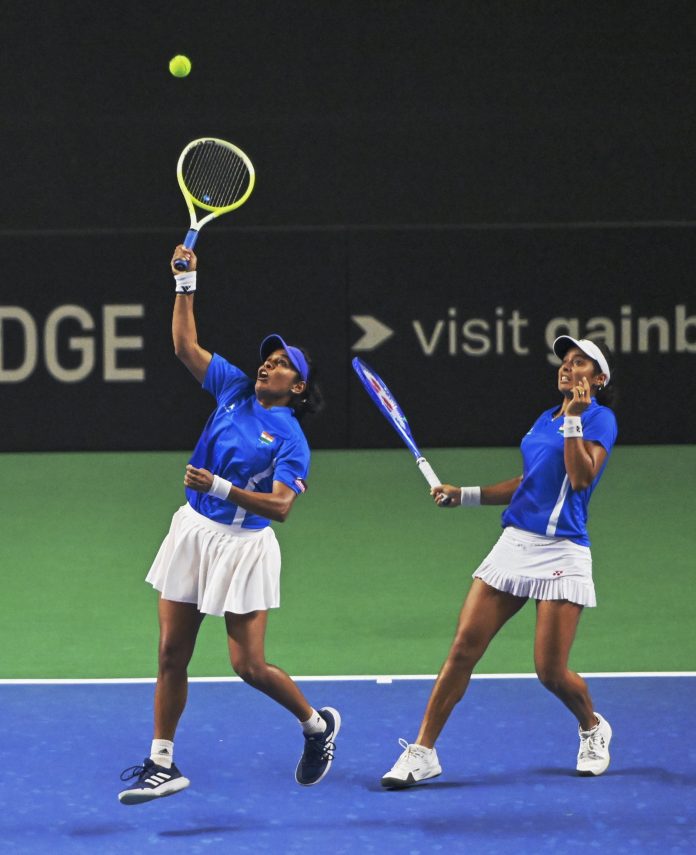 Pune: India�s Prarthana Thombare and Ankita Raina during a women�s doubles tennis match against Thailand�s Peangtarn Plipuech and Patcharin Cheapchandej at the Billie Jean King Cup women�s tennis championship, at the Balewadi Stadium, in Pune, Wednesday, April 9, 2025. (PTI Photo) (PTI04_09_2025_000631B)