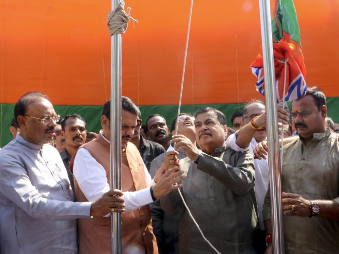 Nagpur: Maharashtra Chief Minister Devendra Fadnavis, BJP state President Chandrashekhar Bawankule and Union Minister Nitin Gadkari during an event on the occasion of BJP’s foundation day, at BJP HQ in Nagpur, Sunday, April 6, 2025. (PTI Photo) (PTI04_06_2025_000079B)