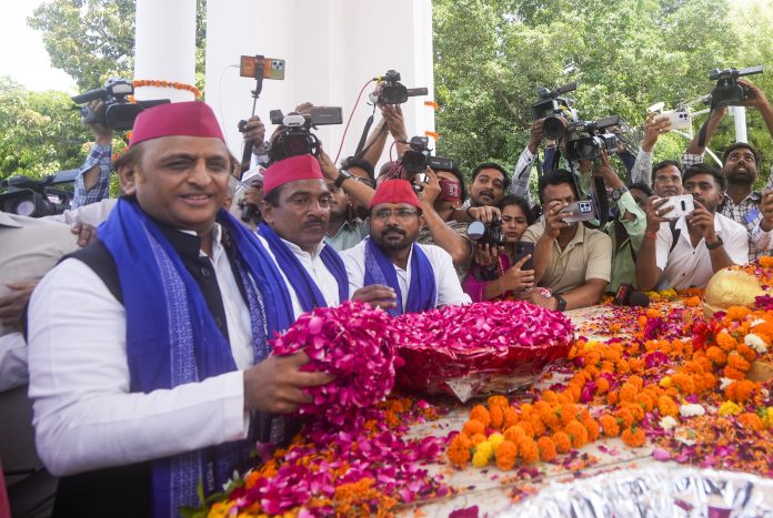Lucknow: Samajwadi Party President Akhilesh Yadav pays tribute to BR Ambedkar on his birth anniversary, in Lucknow, Monday, April 14, 2025. (PTI Photo/Nand Kumar)(PTI04_14_2025_000179B)