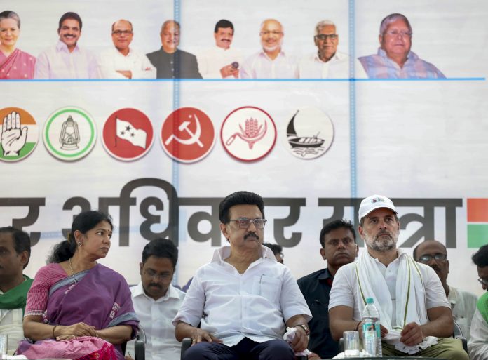 **EDS: THIRD PARTY IMAGE** In this image received on Aug. 27, 2025, LoP in the Lok Sabha and Congress leader Rahul Gandhi, Tamil Nadu Chief Minister MK Stalin and DMK MP Kanimozhi during the 'Voter Adhikar Yatra', in Bihar. (AICC via PTI Photo) (PTI08_27_2025_000149B)