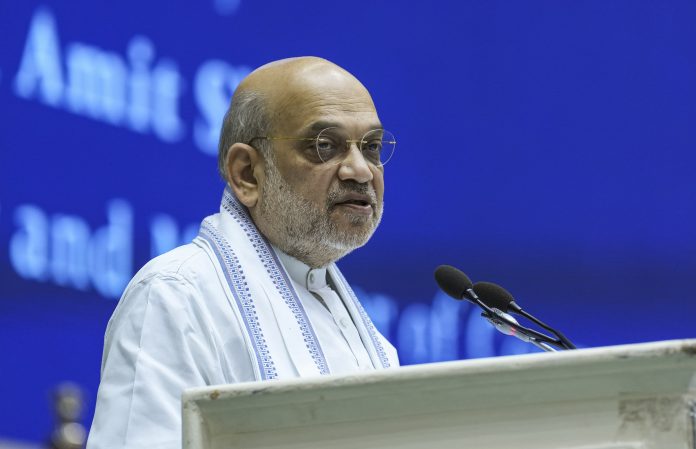 New Delhi: Union Home Minister Amit Shah addresses during the Border Security Force (BSF) Investiture Ceremony and Rustamji Memorial Lecture, in New Delhi, Friday, May, 23, 2025. (PTI Photo/Kamal Singh) (PTI05_23_2025_000074B)
