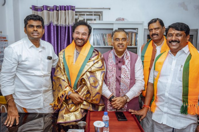 **EDS: THIRD PARTY IMAGE** In this image posted by @kishanreddybjp on April 11, 2025, Union Minister G Kishan Reddy, BJP National General Secretary Tarun Chugh, party’s Tamil Nadu President K Annamalai, Vice President Nainar Nagendran and party leaders Arvind Menon during a meeting at the party office, in Chennai. (@kishanreddybjp on X via PTI Photo) (PTI04_12_2025_000654B)