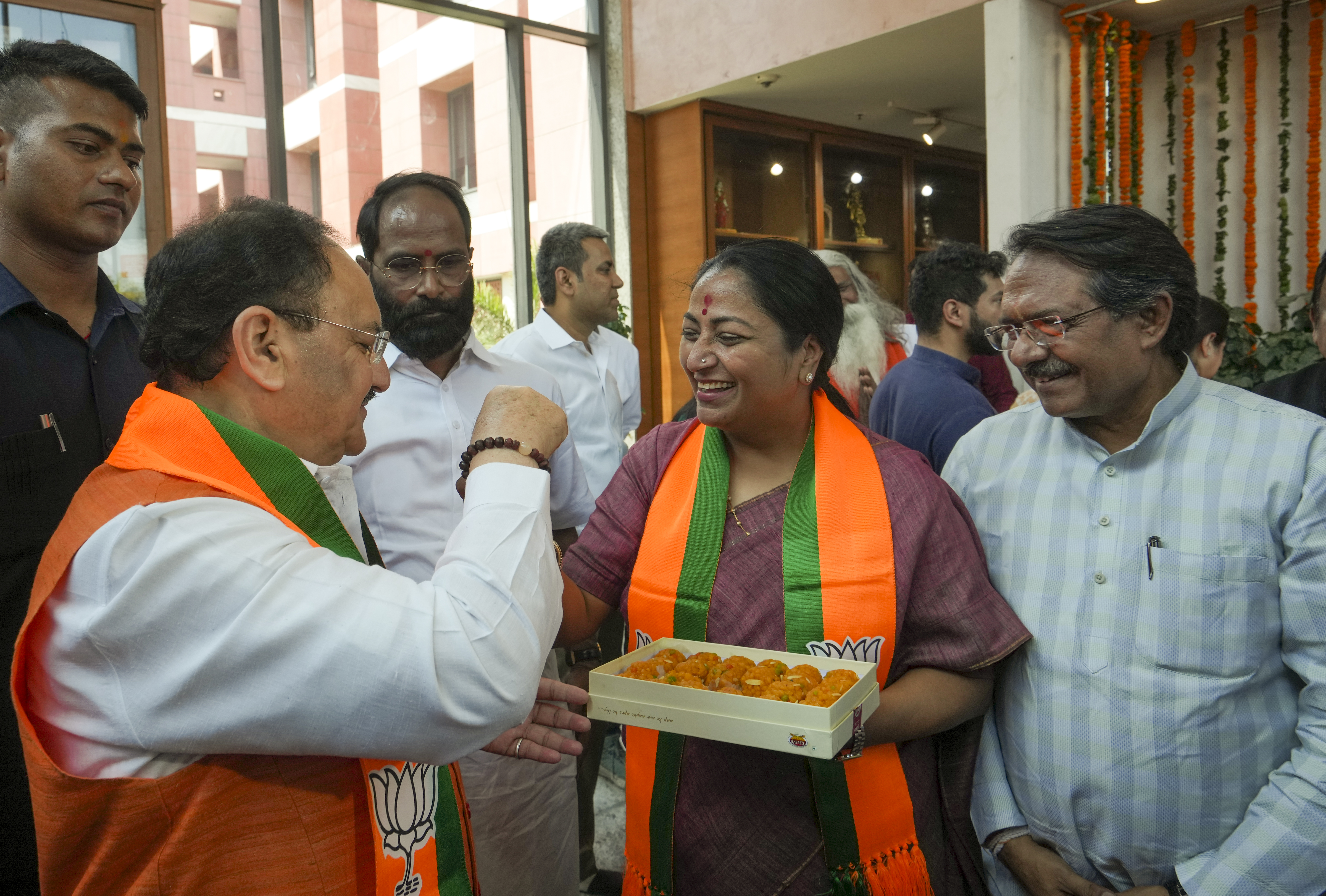 New Delhi: Union Minister and BJP National President JP Nadda being offered sweets by Delhi Chief Minister Rekha Gupta during an event on the occasion of the party�s foundation day, at the party�s headquarters, in New Delhi, Sunday, April 6, 2025. Union Minister of State Harsh Malhotra is also seen. (PTI Photo/Kamal Singh) (PTI04_06_2025_000075B)