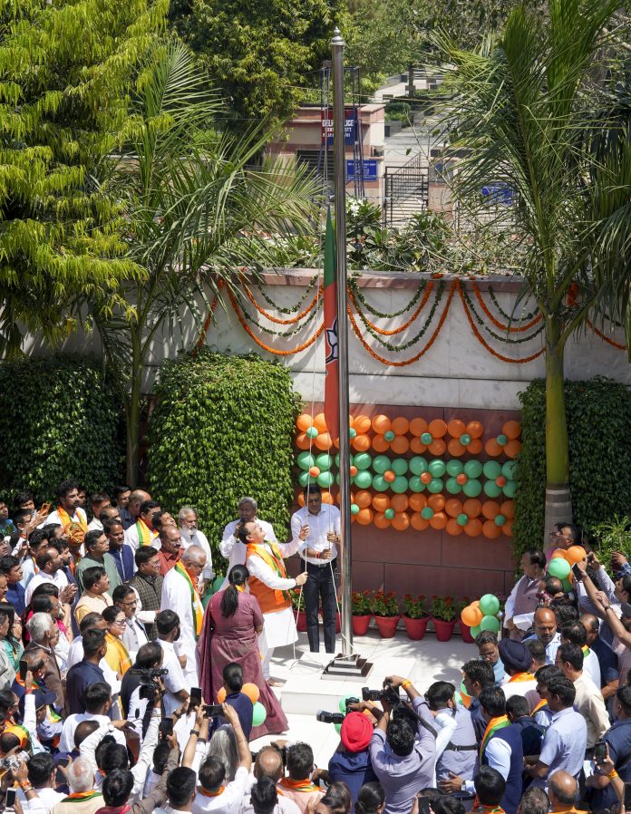New Delhi: Union Minister and BJP National President JP Nadda hoists the party�s flag during an event on the occasion of the party�s foundation day, at the party�s headquarters, in New Delhi, Sunday, April 6, 2025. Delhi Chief Minister Rekha Gupta and BJP leader BL Santhosh are also seen. (PTI Photo/Kamal Singh) (PTI04_06_2025_000135B)
