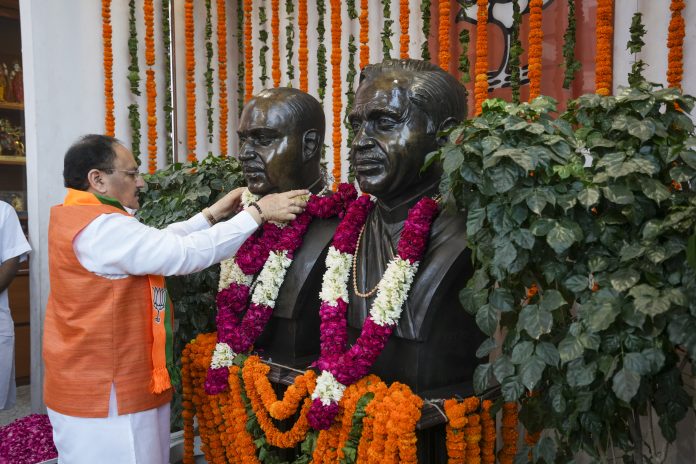 New Delhi: Union Minister and BJP National President JP Nadda pays floral tribute to Syama Prasad Mookerjee and Pandit Deendayal Upadhyaya on the occasion of the party’s foundation day, at the party’s headquarters, in New Delhi, Sunday, April 6, 2025. (PTI Photo/Kamal Singh) (PTI04_06_2025_000080B)