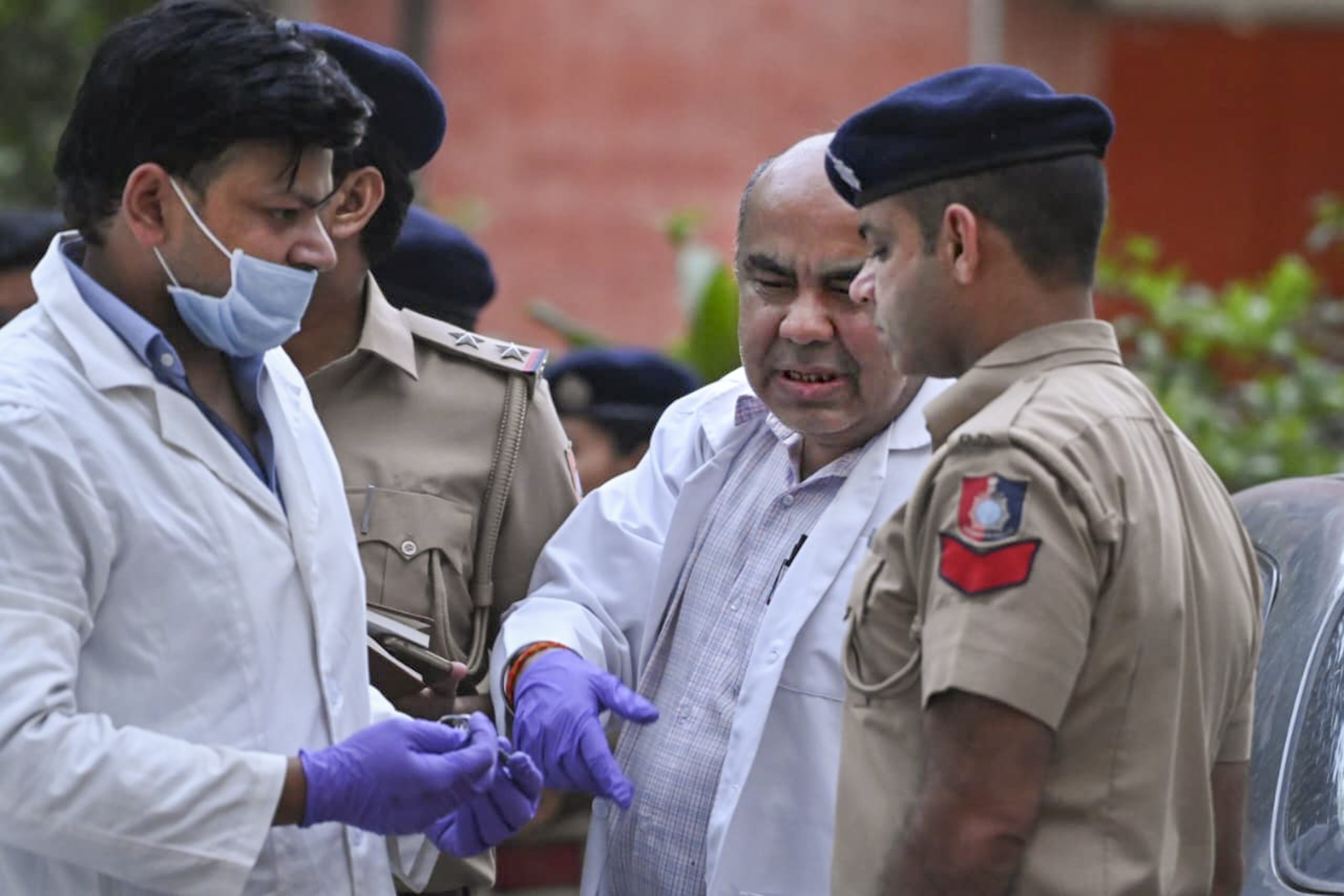 Chandigarh: National Investigation Agency team members with police officials at the site after a blast outside the Punjab BJP headquarters, in Chandigarh, Wednesday, April 1, 2026. (PTI Photo) (PTI04_01_2026_000510B)