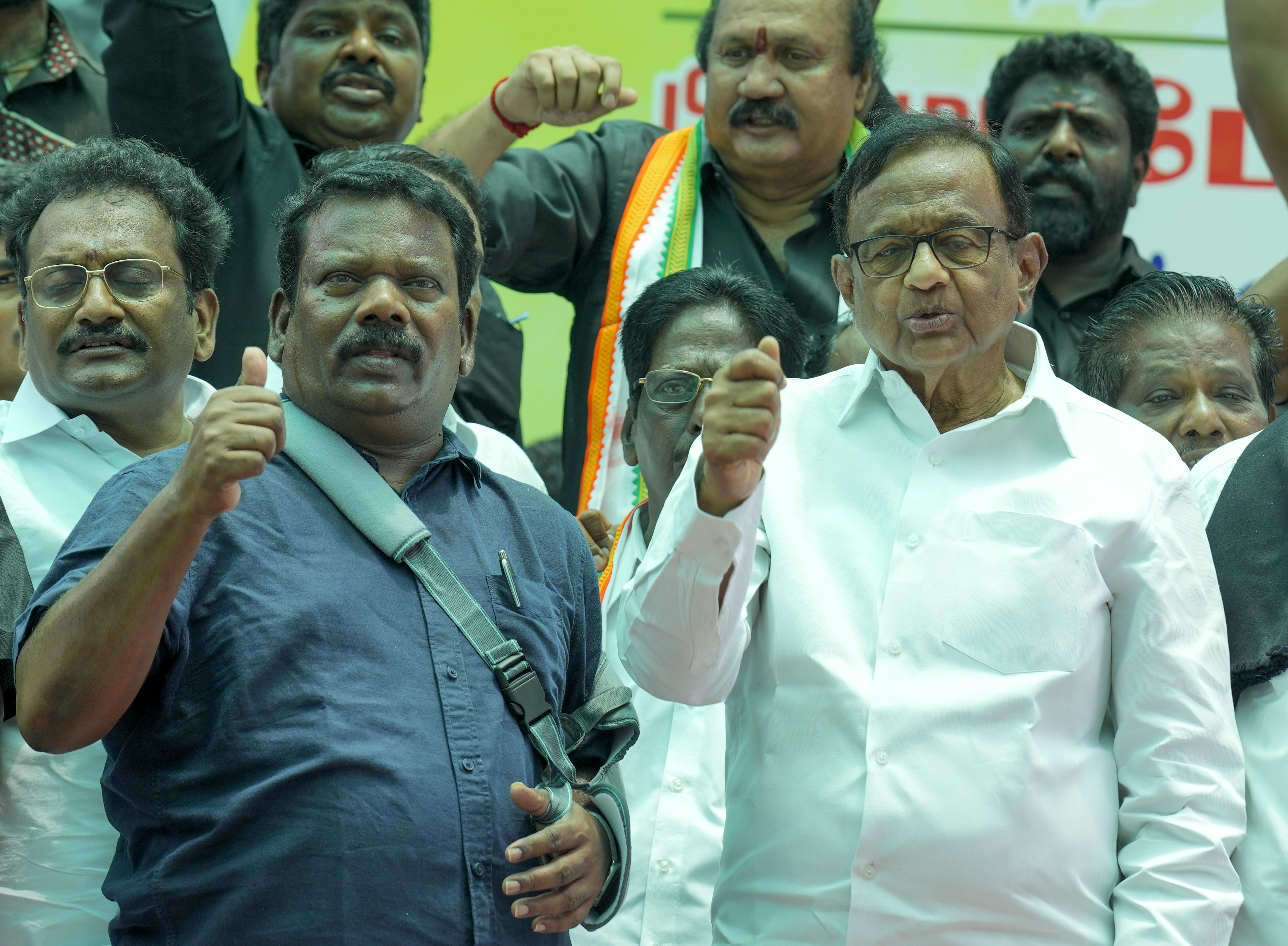 Chennai: Tamil Nadu Congress President K Selvaperunthagai and senior Congress leader P Chidambaram during the black flag protest against Waqf (Amendment) Bill and other issues, in Chennai, Sunday, April 6, 2025. (PTI Photo/R Senthilkumar)(PTI04_06_2025_000175B)