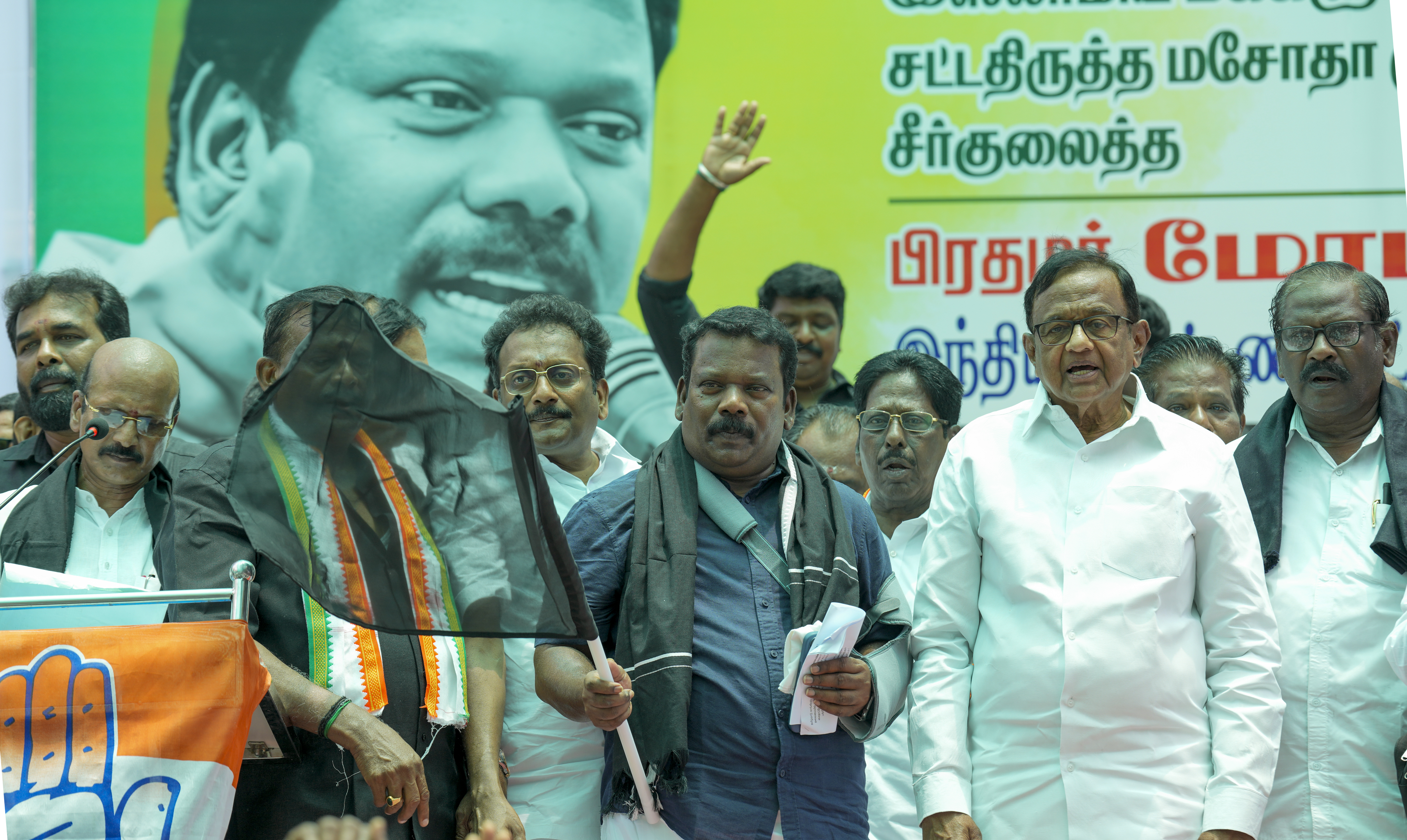 Chennai: Tamil Nadu Congress President K Selvaperunthagai, senior Congress leader P Chidambaram and other leaders during the black flag protest against Waqf (Amendment) Bill and other issues, in Chennai, Sunday, April 6, 2025. (PTI Photo/R Senthilkumar)(PTI04_06_2025_000177B)