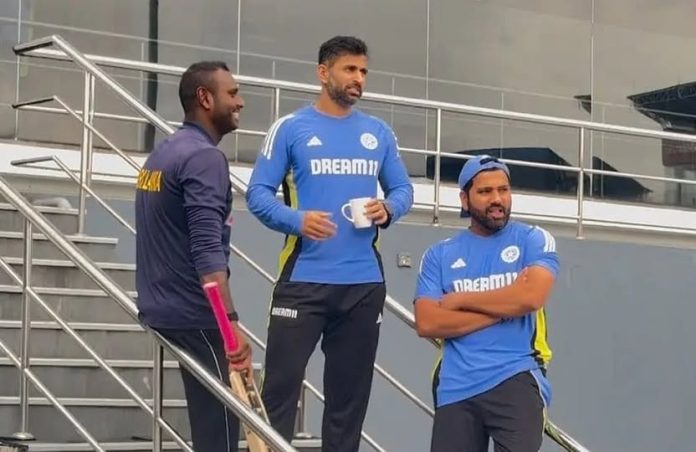 Rohit Sharma with Abhishek Nayar and Angelo Mathews {Facebook}