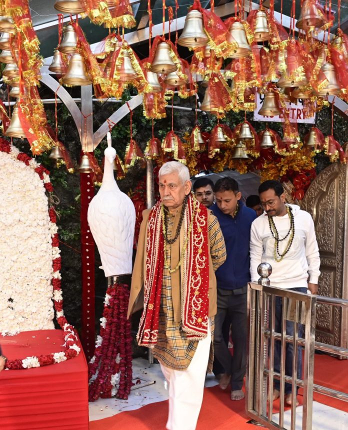 **EDS: THIRD PARTY IMAGE** In this image posted on March 19, 2026, Jammu and Kashmir Lieutenant Governor Manoj Sinha offers prayers at the 'Vaishno Devi Temple' on the occasion of the 'Navratri' festival, in Katra. (@OfficeOfLGJandK/X via PTI Photo)(PTI03_19_2026_000077B)